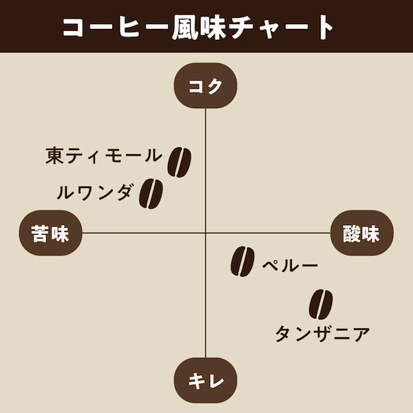 | 原産国名 | 東ティモール、ルワンダ、ペルー、タンザニア |