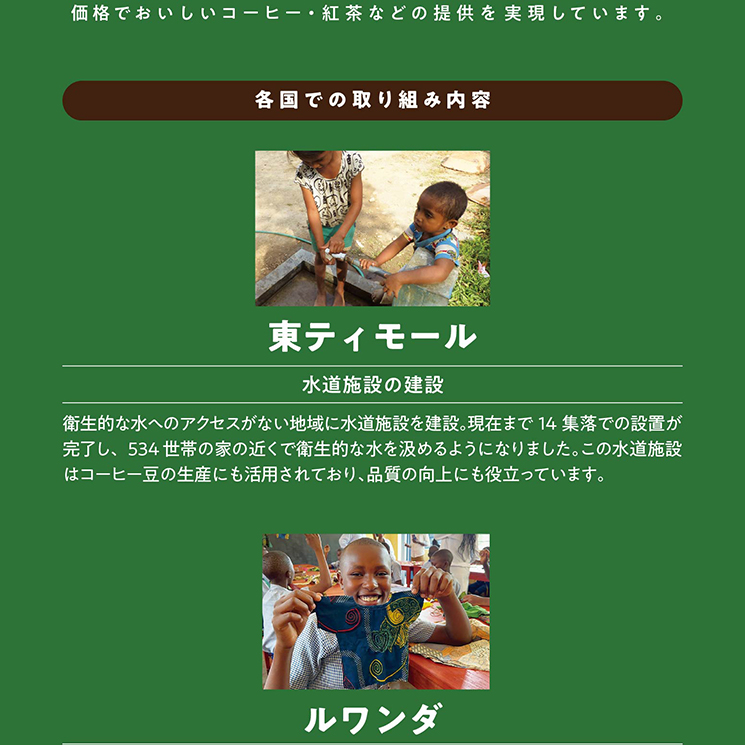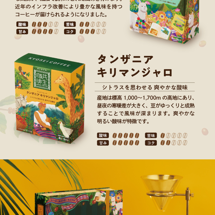 | 内容量 | 東ティモール:8g×5袋 ルワンダ:8g×5袋 ペルー:8g×5袋 タンザニア:8g×5袋 |