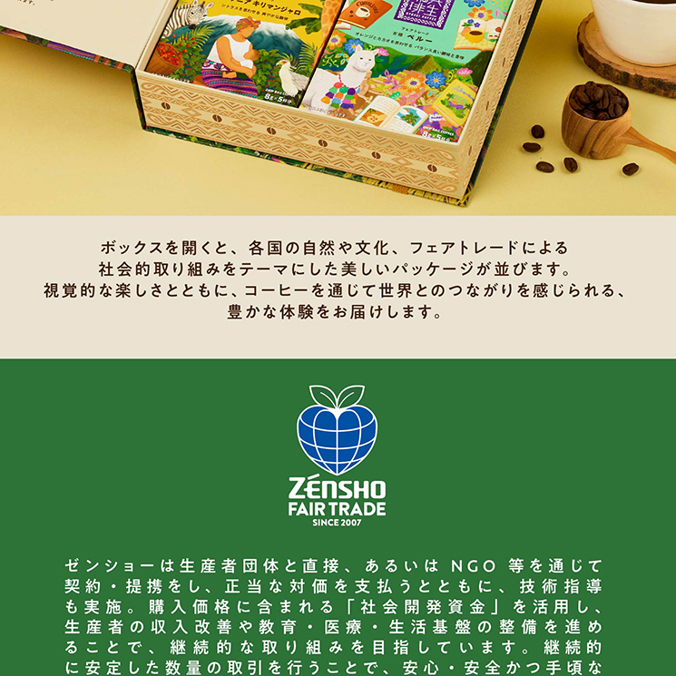 ゼンショーフェアトレード豆を使用した、ドリップバッグ4種ギフトセットが新登場。 産地ごとの個性豊かな香りと味わいを、気軽にお楽しみいただけます。 ギフトにもぴったりな、特製ブック型BOXでお届けします。