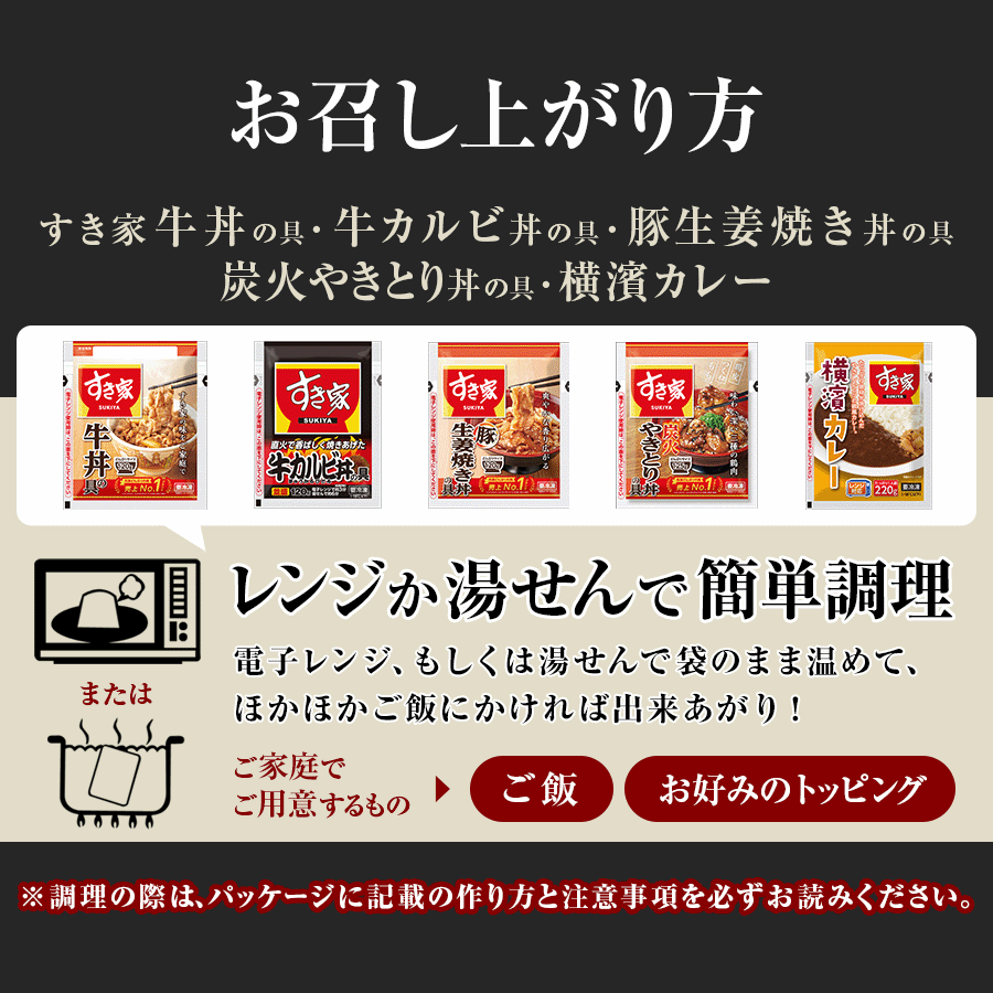 | 調理方法 | 『すき家 牛丼の具120g』・・・電子レンジ、湯せん 『すき家 牛カルビ丼の具120g』・・・電子レンジ、湯せん 『すき家 豚生姜焼き丼の具120g』・・・電子レンジ、湯せん 『すき家 炭火やきとり丼の具125g』・・・電子レンジ(※破裂防止のため、500W以下で加熱してください。)、湯せん 『すき家 横濱カレー220g』・・・電子レンジ、湯せん 『なか卯 カツ丼の具』・・・電子レンジ ※ご家庭で『卵』は別途ご用意下さい。 ※詳しくは商品パッケージに記載の調理方法をご覧ください。 |