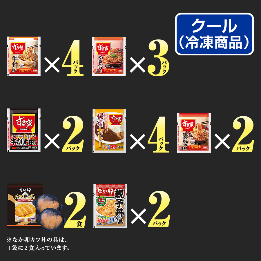 | 名称 | 『すき家 牛丼の具120g』・・・牛丼の具 『すき家 牛カルビ丼の具120g』・・・牛カルビ丼の具 『すき家 豚生姜焼き丼の具120g』・・・豚生姜焼き丼の具 『すき家 炭火やきとり丼の具120g』・・・冷凍炭火やきとり丼の具 『すき家 横濱カレー220g』・・・冷凍カレー 『なか卯 カツ丼の具』・・・かつ煮(カツ丼の具) 『なか卯 親子丼の具』・・・冷凍親子丼の具 |