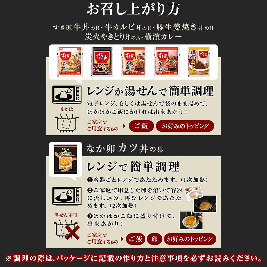 | 調理方法 | 『すき家 牛丼の具120g』・・・電子レンジ、湯せん 『すき家 牛カルビ丼の具120g』・・・電子レンジ、湯せん 『すき家 豚生姜焼き丼の具120g』・・・電子レンジ、湯せん 『すき家 炭火やきとり丼の具120g』・・・電子レンジ(※破裂防止のため、500W以下で加熱してください。)、湯せん 『すき家 横濱カレー220g』・・・電子レンジ、湯せん 『なか卯 カツ丼の具』・・・電子レンジ ※ご家庭で『卵』は別途ご用意下さい。 『なか卯 親子丼の具』・・・電子レンジまたは湯せんで加熱後、小鍋にて再度加熱調理 ※ご家庭で『卵』は別途ご用意下さい。 ※詳しくは商品パッケージに記載の調理方法をご覧ください。 |
