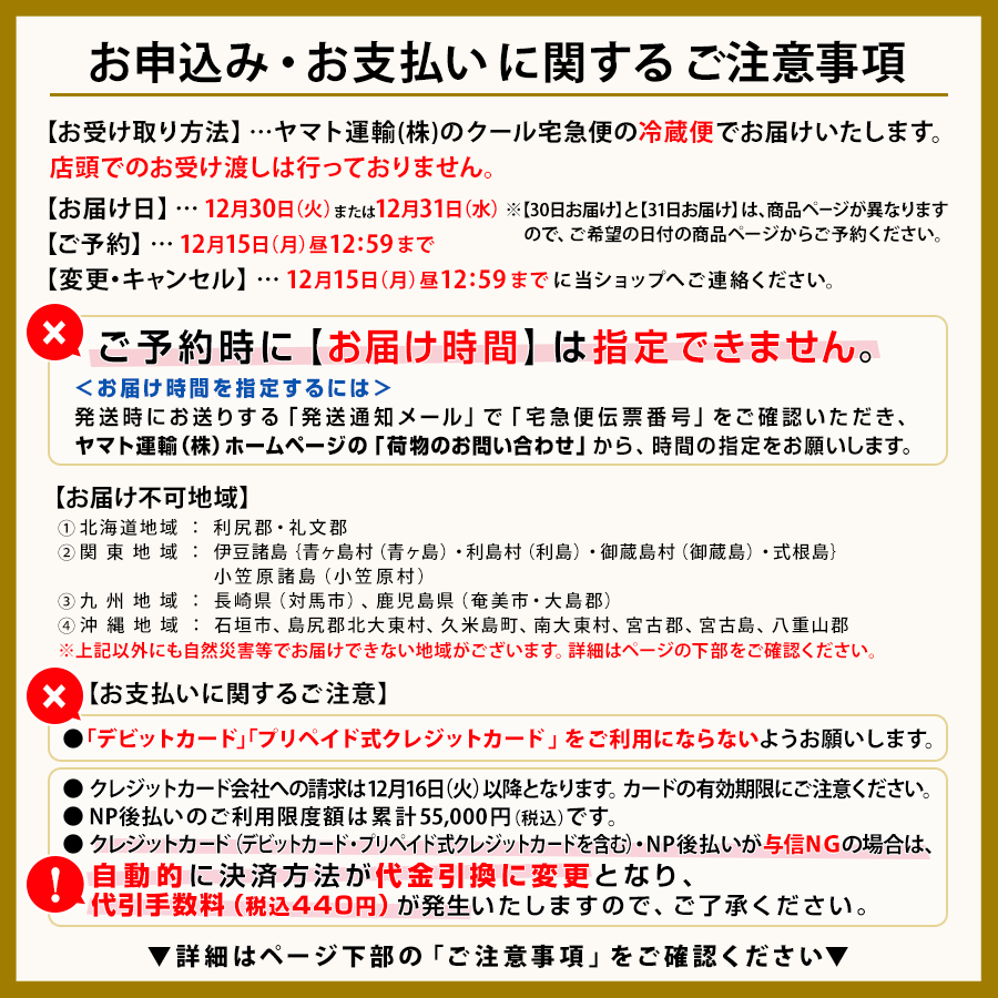 ● ご予約・お届け先の変更・キャンセルは、12/15(月)昼12:59までとなります。