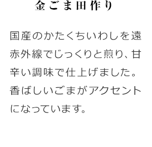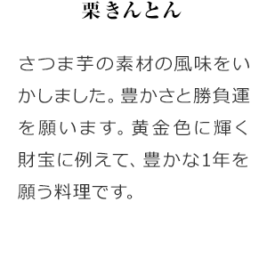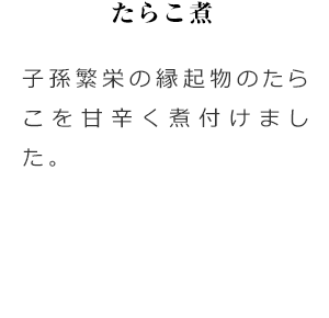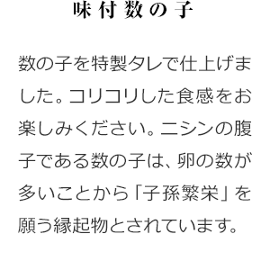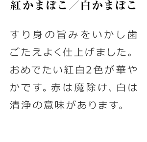 その他注意事項 | ※写真はイメージです。実際の内容量とは異なる場合があります。 ※産地について一定の物を使用すべく努力しておりますが、季節による変動、収穫量(漁獲量)の多少などの事情によりやむをえず変更する場合がございます。 ※紅白かまぼこの原材料の魚は「えび、かに」を食べています。 ※金ごま田作りのかたくちいわしは「えび、かに」が混ざる漁法で採取されています。 |