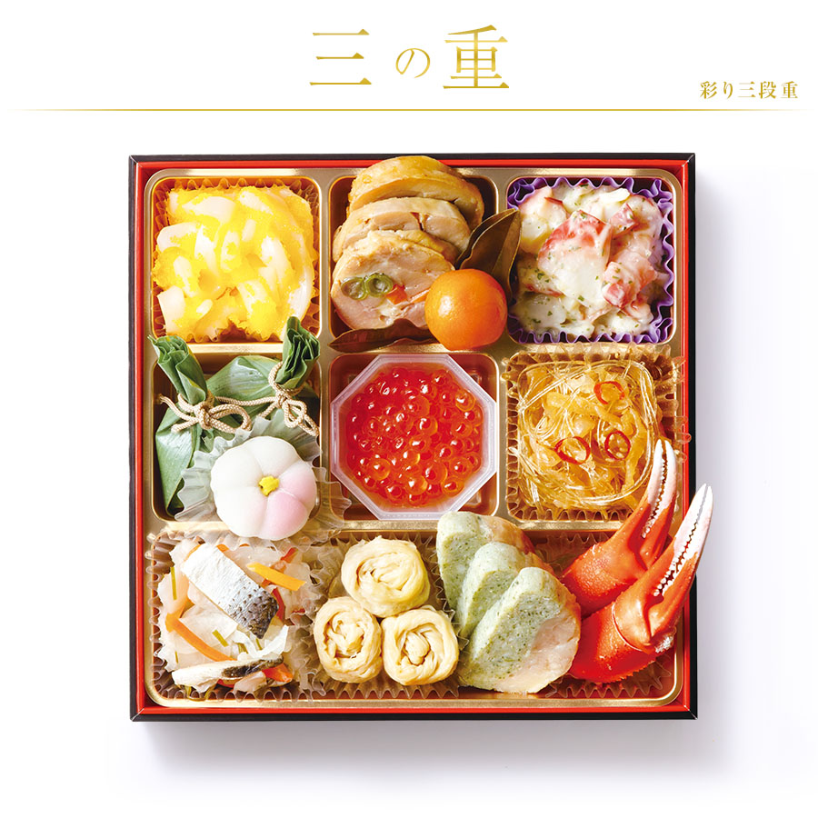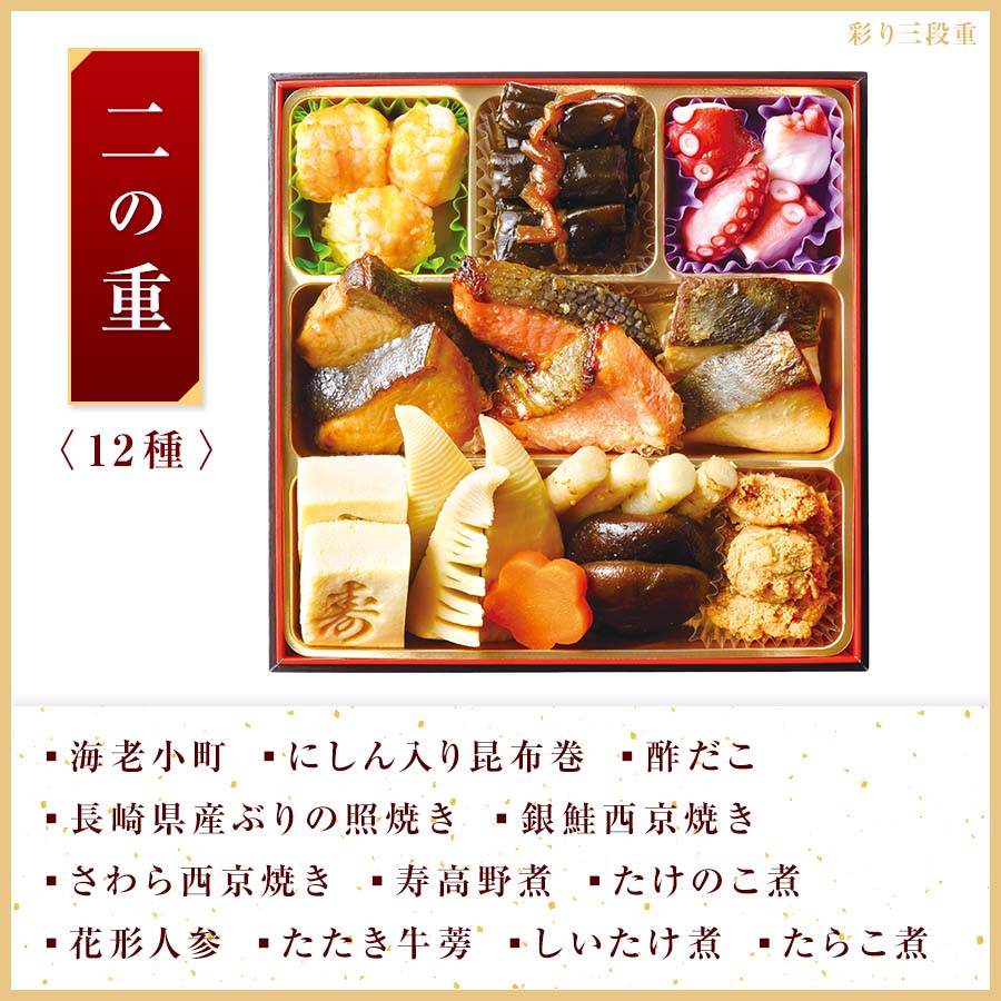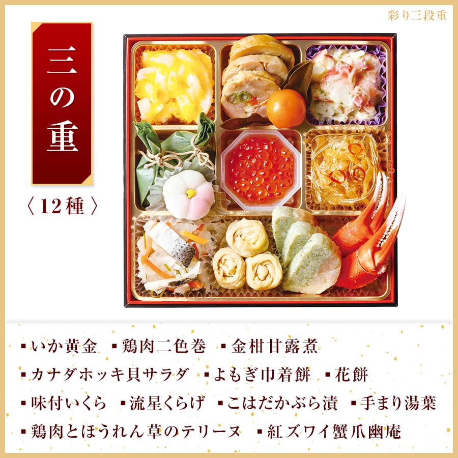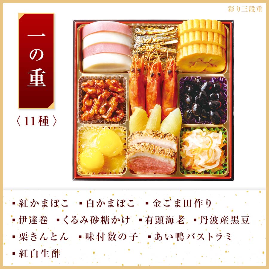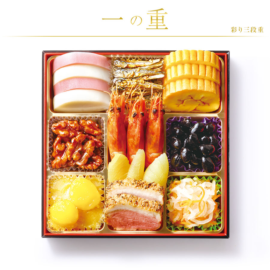 その他注意事項 | ※写真はイメージです。実際の内容量とは異なる場合があります。 ※産地について一定の物を使用すべく努力しておりますが、季節による変動、収穫量(漁獲量)の多少などの事情によりやむをえず変更する場合がございます。 ※紅白かまぼこの原材料の魚は「えび、かに」を食べています。 ※金ごま田作りのかたくちいわしは「えび、かに」が混ざる漁法で採取されています。 ※カナダホッキ貝サラダのカナダホッキ貝は「かに」が混ざる漁法で採取されています。 |
