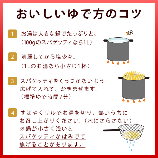 | その他注意事項 | ・商品の改訂等により、商品パッケージの記載内容やデザインが異なる場合があります。お召し上がりの際は、必ずお手元の商品に記載の表示をご確認ください。 ・ページ内の写真は、調理例、盛り付け例などイメージです。 ※開封後は、吸湿・虫害などを防ぐため、袋口をしっかり閉めてください。 ※細かい斑点は原料のデュラム セモリナの特徴です。品質には問題ありません。 ※スパゲッティの結束テープは食べられません。 |