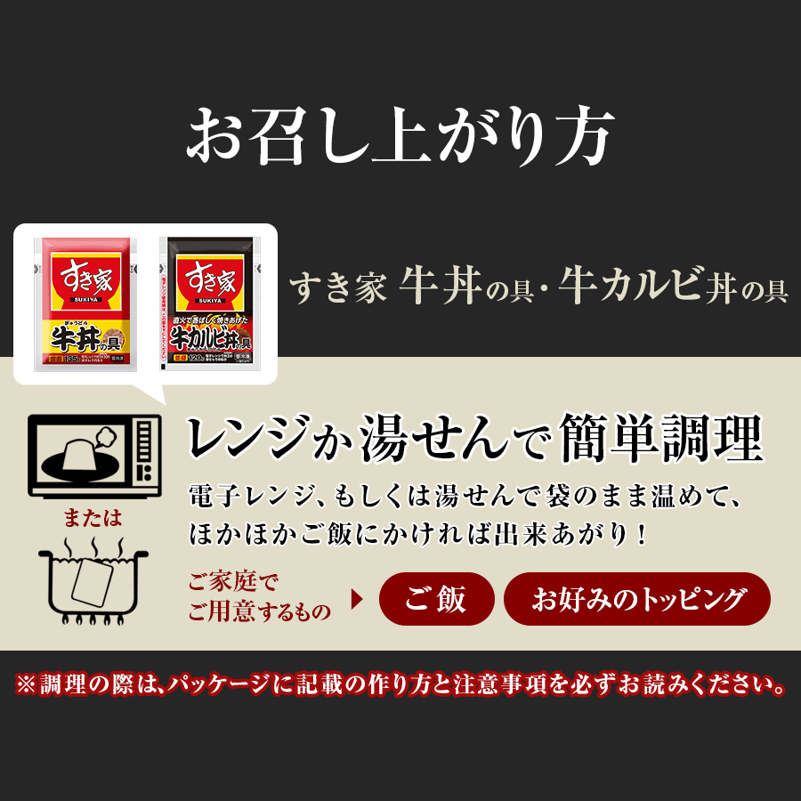 調理方法 | 『すき家 牛丼の具120g』『すき家 牛カルビ丼の具』・・・電子レンジ、湯せん 『なか卯 親子丼の具』・・・電子レンジまたは湯せんで加熱後、小鍋にて再度加熱調理 ※ご家庭で『卵』と『ご飯』は別途ご用意ください。 ※詳しくは商品パッケージに記載の調理方法をご覧ください。 |